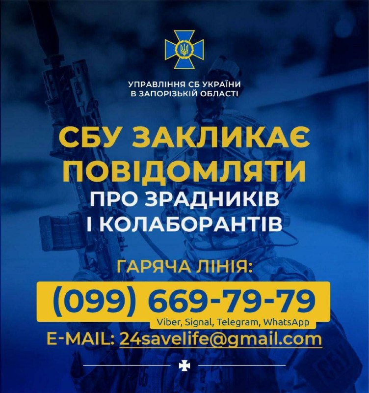 📌 Гаряча лінія Управління СБУ в Запорізькій області (Whatsapp, Signal, Telegram, Viber): 099-669-79-79.