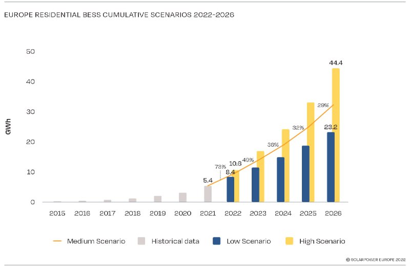 Кількість побутових акумуляторних систем зберігання енергії (BESS), встановлених в Європі, зросла з 650 тис. у 2021 році до понад мільйона в 2022-му. На п’ять європейських ринків домашніх акумуляторів – Німеччини, Італії, Австрії, Великої Британії та Швейцарії – припало 88% встановлених в Європі ще у 2021 році, з них 59% – в Німеччині.
