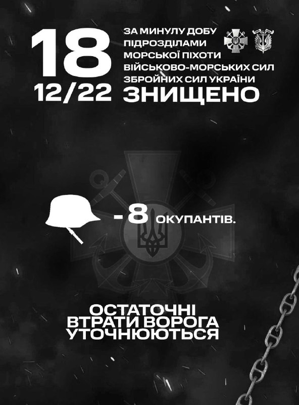 Військові частини та підрозділи Командування морської піхоти Військово-Морських Сил Збройних Сил України, які входять до складу угруповань продовжували виконувати завдання щодо відсічі повномасштабної збройної агресії російської федерації. Минулої доби, 17 грудня, морські піхотинці знищили 2 окупантів.