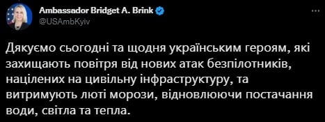 💪«Дякуємо сьогодні та щодня українським героям, які захищають повітря від нових атак безпілотників, націлених на цивільну інфраструктуру, та витримують люті морози, відновлюючи постачання води, світла та тепла», — зазначилаПосол Сполучених Штатів Америки в Україні Бріджит Брінк після атаки російських дронів на Україну 19 грудня.