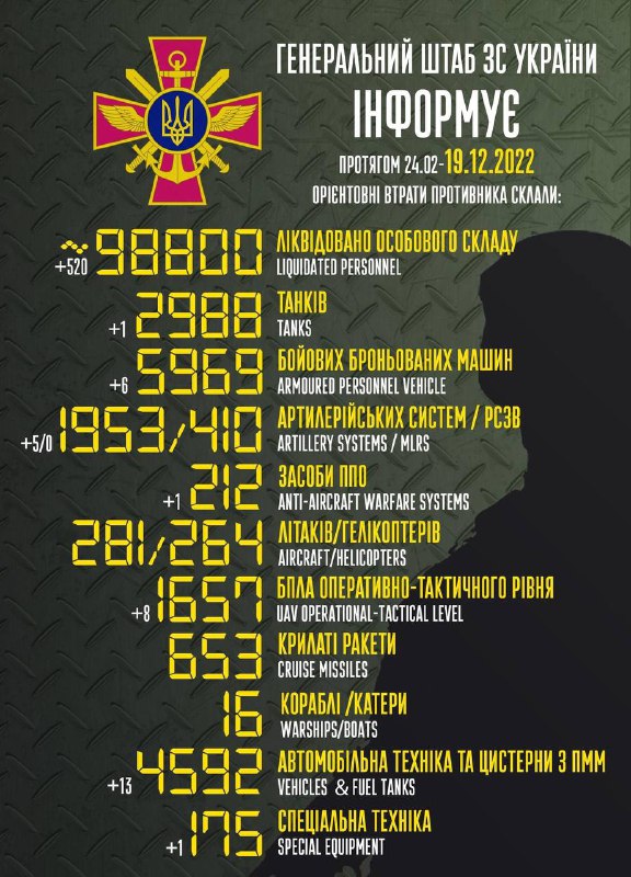 Загальні бойові втрати противника з 24.02 по 19.12 орієнтовно склали / The total combat losses of the enemy from 24.02 to 19.12 were approximately: