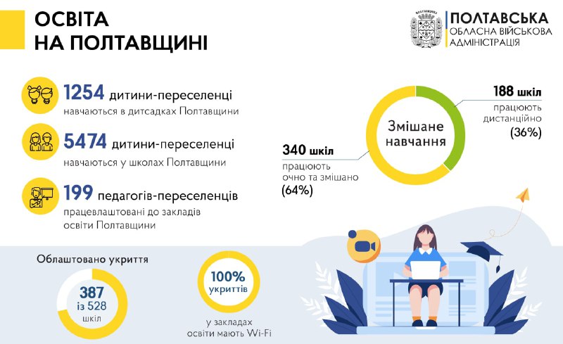 Більшість наших шкіл використовують очну та змішану форму навчання – 340. Працюють дистанційно 188 шкіл. Але головне – безпека – облаштовані укриття у 387 школах із 528. 100% укриттів у закладах освіти Полтавщини мають Wi-Fi.
