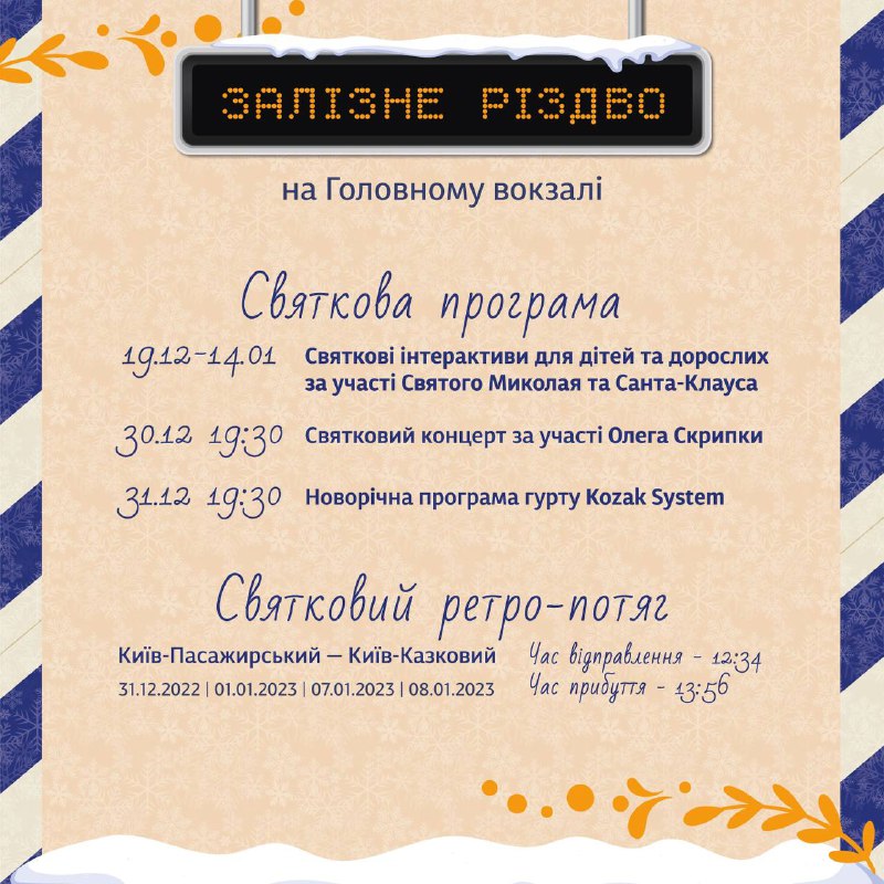 🌲Ще плануєте, як святкувати Новий рік! У нас є для вас декілька гарних ідей! 28.12.2022, Середа | 13:36 Автор допису: Укрзалізниця 🌲Ще плануєте, як святкувати Новий рік! У нас є для вас декілька гарних ідей! 🗓️30 та 31 грудня на Центральному залізничному вокзалі заплановано крутезні концерти топових українських гуртів. 🎅Також тут на вас чекатиме Святий Миколай, енергонезалежна залізна ялинка та кава і солодощі від наших партнерів. Джерело Друк / PDF