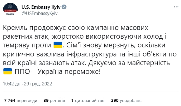 «Сім'ї знову мерзнуть, оскільки критично важлива інфраструктура та інші об'єкти по всій країні зазнають атак. Дякуємо за майстерність української ППО – Україна переможе!», – прокоментувало посольство США у своєму Twitter.