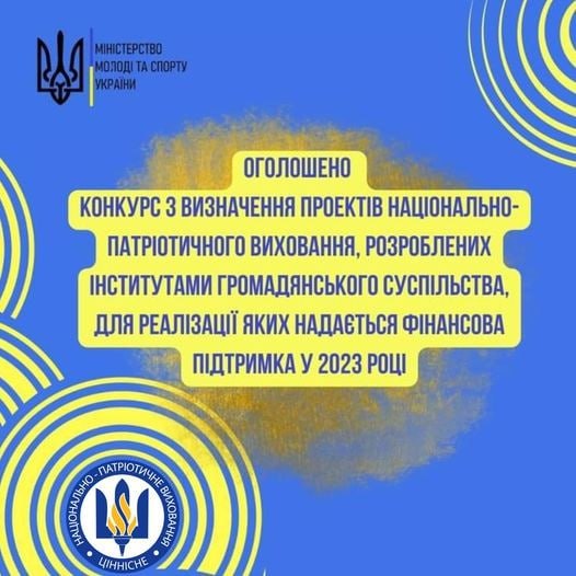 Міністерство молоді та спорту України оголошує конкурс з визначення проектів національно-патріотичного виховання, розроблених інститутами громадянського суспільства, для реалізації яких надається фінансова підтримка у 2023 році.