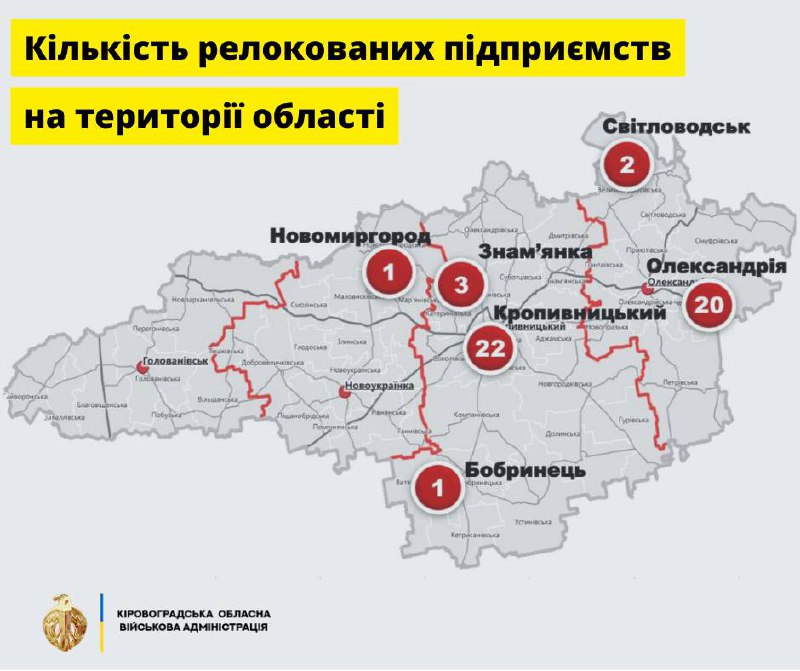 З початку війни Кіровоградщина прийняла 49 релокованих підприємств з Луганської, Харківської, Донецької, Одеської, Київської, Миколаївської, Запорізької, Херсонської областей.