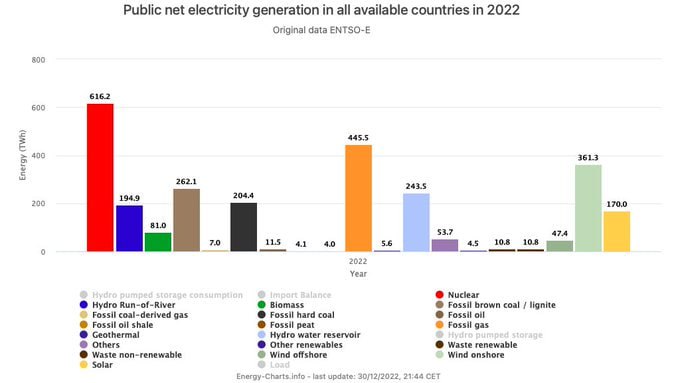 ⚛️ Ядерна енергетика у 2022 році залишилась провідним джерелом електроенергії в Європі 1 7.01.2023, Субота | 18:15 Автор допису: Енергоатом ⚛️ Ядерна енергетика у 2022 році залишилась провідним джерелом електроенергії в Європі 1. Ядерна енергетика ⚛️ – 616 ТВт-год2. Вугілля ⚫️ – 467 ТВт-год3. Викопний газ 🔥 – 446 ТВт-год4. Геотермальна енергетика💧– 439 ТВт-год5. Вітроенергетика 🌬 – 409 ТВт-год6. Сонячна енергетика ☀️ – 170 ТВт-год7. Біоенергетика 🪵 – 81 ТВт-год twitter.com/voixdunucleaire/status/1610190431555555330 Написати нам 🇺🇦 | | IN Джерело Друк / PDF