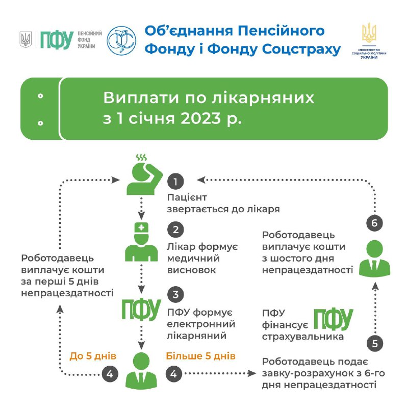 🔹лікар в електронній системі охорони здоров’я формує медичний висновок про тимчасову непрацездатність, який в режимі онлайн надходить до електронного реєстру листків непрацездатності Пенсійного фонду де одразу формується електронний лікарняний;