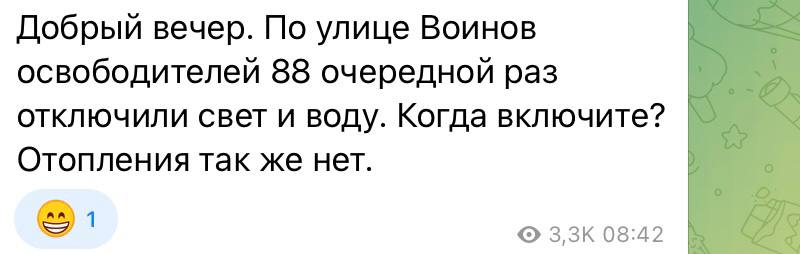 😖росіяни та колаборанти показують по пропагандистському ТБ пункти обігріву, які відкрили у місті. У людей це викликало лише гнів, адже вони просто замерзають у власних будинках.