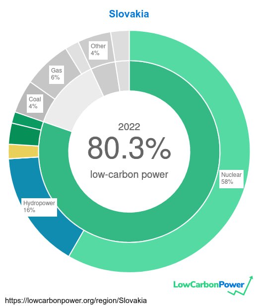 🇸🇰 У 2022 році Словаччина вперше виробила 80% низьковуглецевої електроенергії, з них 58% 14.01.2023, Субота | 20:43 Автор допису: Енергоатом 🇸🇰 У 2022 році Словаччина вперше виробила 80% низьковуглецевої електроенергії, з них 58% – завдяки атомній енергетиці.В країні експлуатуються чотири ядерні енергоблоки: по два на АЕС Богуниці та АЕС Моховце, загальною потужністю майже 1900 МВт. twitter.com/lowcarbonpower/status/1613249950598705152 🇺🇦 | | IN Джерело Друк / PDF