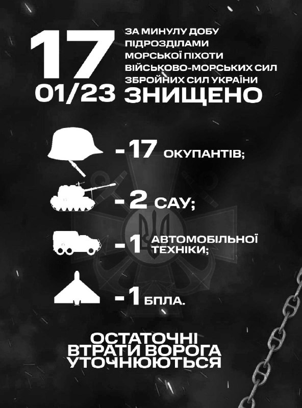 Військові частини та підрозділи Командування морської піхоти Військово-Морських Сил Збройних Сил України, які входять до складу угруповань продовжували виконувати завдання щодо відсічі повномасштабної збройної агресії російської федерації. Минулої доби, 16 січня, морські піхотинці знищили вантажівку, БПЛА та 13 окупантів.