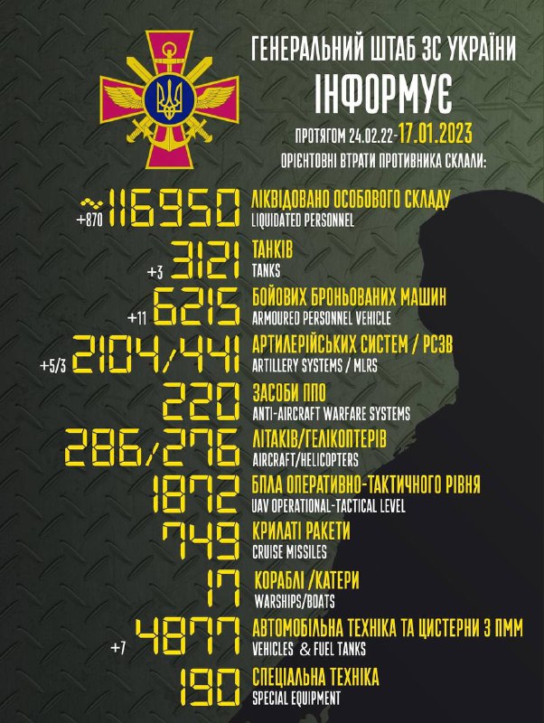 Загальні бойові втрати противника з 24.02.22 по 17.01.23 орієнтовно склали / The total combat losses of the enemy from 24.02.22 to 17.01.23 were appro