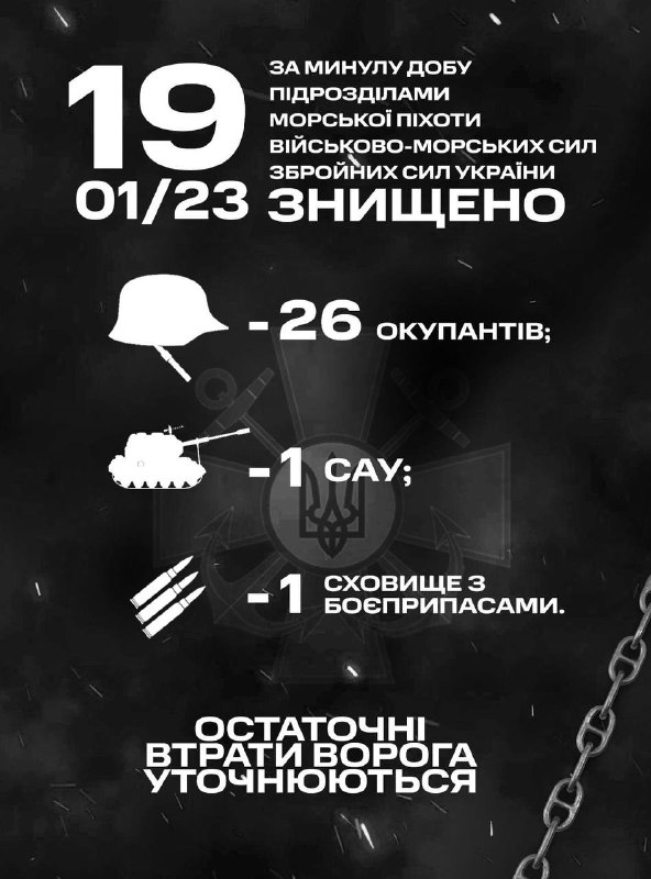 Військові частини та підрозділи Командування морської піхоти Військово-Морських Сил Збройних Сил України, які входять до складу угруповань продовжували виконувати завдання щодо відсічі повномасштабної збройної агресії російської федерації. Минулої доби, 18 січня, морські піхотинці знищили 17 окупантів.