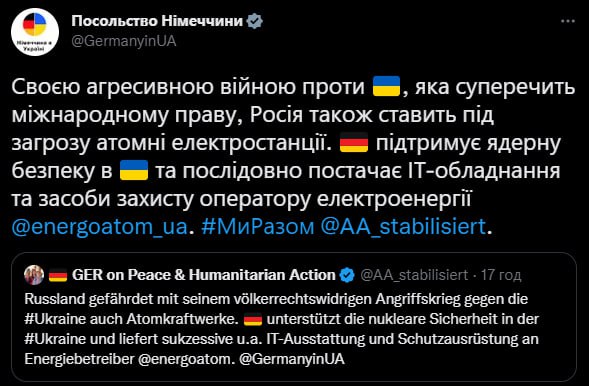 «Своєю агресивною війною проти України, яка суперечить міжнародному праву, росія також ставить під загрозу атомні електростанції. Німеччина підтримує ядерну безпеку в Україні та послідовно постачає ІТ-обладнання і засоби захисту оператору електроенергії», – йдеться в повідомленні Посольства Німеччини в Twitter.