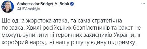 🇺🇸«Ще одна жорстока атака, та сама стратегічна поразка. Хвилі російських безпілотників та ракет не можуть зупинити ні героїчних захисників України, її хоробрий народ, ні нашу рішучу єдину підтримку», – прокоментувала чергову атаку на Україну посол СШАБріджит Брінк у Twitter.