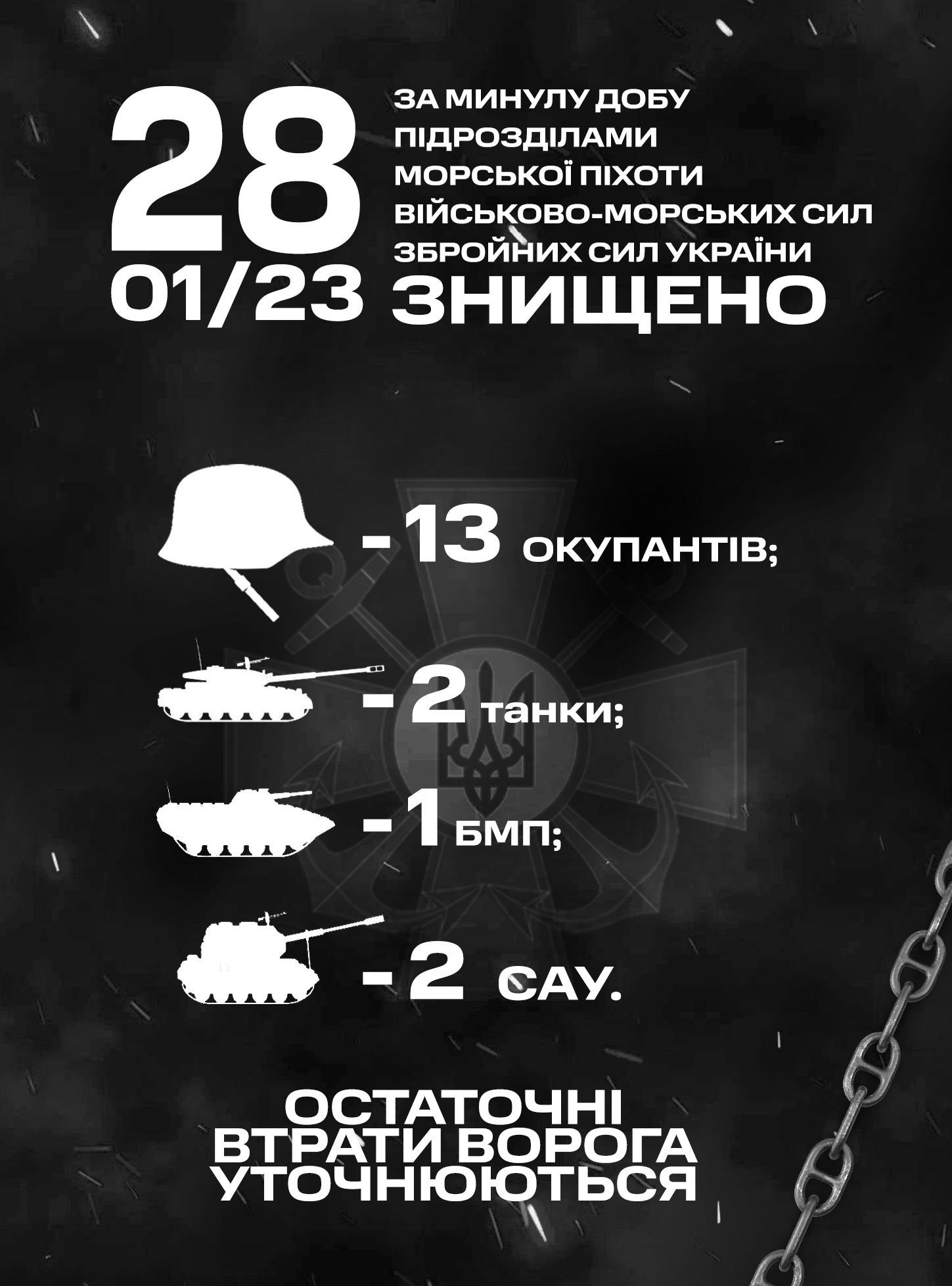 ​​Військові частини та підрозділи Командування морської піхоти Військово-Морських Сил Збройних Сил України, які входять до складу угруповань продовжували виконувати завдання щодо відсічі повномасштабної збройної агресії російської федерації. Минулої доби, 27 січня, морські піхотинці знищили танк, БМП та 9 окупантів.