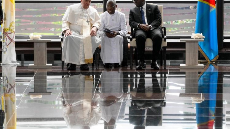 В аеропорту зібралися представники влади та ієрархії, а також група вірних. Церемонія офіційної зустрічі не передбачала промов. Папу зустрів Прем’єр-міністр Жан-Мішель Сама Луконде. Діти вручили Святішому Отцеві квіти. Глава Уряду провів гостя до VIP-залу летовища, де відбулося представлення делегацій і коротка розмова. З аеропорту Папа від’їхав до Національного палацу – офіційної резиденції Президента ДР Конго, де відбудеться церемонія привітання.