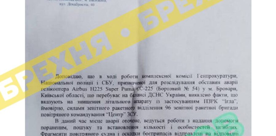 Пропагандисти опублікували брехливий документ, у якому ніби йдеться про причини падіння (https://t.me/spravdi/24271) вертольота в Броварах. У ньому йдеться про те, що гвинтокрил нібито збили «Іглою».