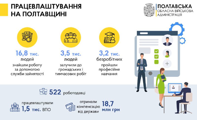 Вакансії в Полтаві та області можна знайти в телеграм-каналі «Робота Полтава ЦЗ»: t.me/Polt_robota або звернутися до обласного центру зайнятості чи його філій. Телефони для довідок: (0532) 571951, 0508565065, 0508163418, 0687806737.