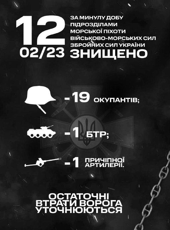 Військові частини та підрозділи Командування морської піхоти Військово-Морських Сил Збройних Сил України, які входять до складу угруповань продовжували виконувати завдання щодо відсічі повномасштабної збройної агресії російської федерації. Минулої доби, 11 лютого, морські піхотинці знищили 14 окупантів.