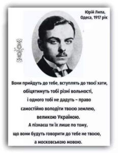 Сьогодні ми згадаємо одного із ідеологів українського націоналізму, громадського діяча, письменника, лікаря, автора української геополітичної концепції, а ще — одного із засновників нового напряму української медичної науки — фітотерапії Юрія Липи. Він безмежно вірив у велике майбуття України та її духовну міць. Був заледве не першим з-поміж українських теоретиків-ідеологів, хто сповідував європейський шлях розвитку України. У своїх історико-філософських працях «Українська доба», «Українська раса», славетній геополітичній трилогії «Призначення України» Липа визначив місію та обгрунтував геополітичну концепцію України, окреслив шляхи майбутнього розвитку України як держави та українців як великої нації. Юрій Іванович Липа народився 5 травня 1900 року в Одесі. Батько Юрія — відомий український письменник, лікар, політик-самостійник. Юрій Липа навчався в Одеській гімназії №4, пізніше у Одеському університеті. У 17 років редагував часопис «Вісник Одеси», написав свої перші брошури: «Союз визволення України», «Королівство Київське за проектом Бісмарка», «Носіть свої відзнаки», «Гетьман Іван Мазепа», (були надруковані у видавництві «Народний стяг», заснованому Липою-старшим). Перед загрозою більшовицького перевороту юнак вступає до Гайдамацької дивізії, стає козаком першого пластунського куреня та заступником командира одеської «Січі», бере участь у боях 1918 році з більшовиками на одеських вулицях. У 1920-22 рр. Юрій Липа перебував у таборі для інтернованих військових Армії УНР та УГА у Тарнові. 1922 р. вступив на медичний факультет Познанського університету (Польща). Друкувався в часописі «Літературно-науковий вісник». Вже перша поетична збірка Юрія Липи — «Світлість» (1925 р.) — була високо поцінована і читачами, й літераторами та літературними критиками. Відомий письменник Євген Маланюк, зокрема, зазначив, що світові явилася українська зірка, «якій подібної досі не було». У 1943 році польська Армія Крайова висуває Юрію Липі ультиматум із вимогою покинути терени Польщі. Разом з дружиною, художницею Галиною Захарясевич, із якою взяв шлюб 1937 році, та доньками Іванною й Мартою, він переїздить на Львівщину, до Яворова. Бере активну участь в українському повстанському русі: організовує курси медиків для УПА та проводить на них навчання; пише тексти листівок і відозв до мешканців краю. Із липня 1944 року — інструктор Старшинської школи УПА в Карпатах. Постать Юрія Липи була настільки значущою, що 1943 році його діяльність помітили у вищому державному проводі фашистської Німеччини. За наказом Гітлера Юрія Липу було перепроваджено до Берліна, оскільки, на думку правителів Німеччини, він був найбільшим українським ідеологом-державником. Йому було запропоновано очолити маріонетковий уряд України. Однак Юрій з гідністю відкинув цю ганебну пропозицію. І, на диво, залишився живим. Вирватися живим із пазурів НКВД патріотові не вдалося. Вже 19 серпня 1944 року під будинок, де мешкала родина Лип, під’їхало бричкою четверо офіцерів-енкаведистів. Юрію було сказано збиратися, взяти з собою медичні інструменти. Дружині — під «честноє фіцерскоє слово» — було обіцяно, що чоловік повернеться за дві-три години. Однак більше його серед живих не бачили. Юрій Іванович Липа помер на світанку 20 серпня 1944 року в с.Шутова, після дводобового жахливого катування. 
