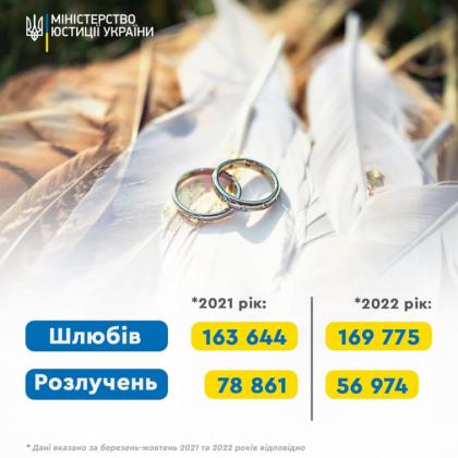 У період з березня по жовтень 2022 року одружилися понад 169 тисяч пар, а розлучилися – понад 56 тисяч.