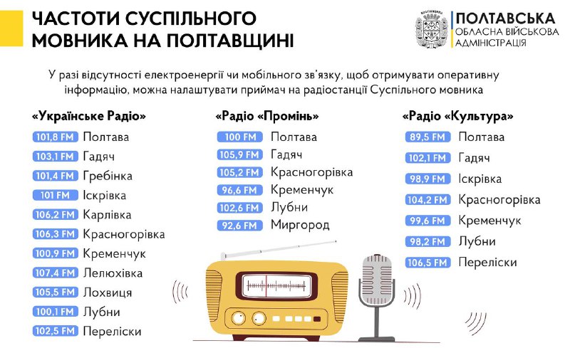 У разі відсутності світла та зв'язку важливо отримувати актуальну й достовірну інформацію. Можна скористатися радіоприймачем, який живиться від батарейок, і налаштувати його на FM-хвилі Суспільного мовника. В інфографіці – перелік частот у Полтавській області.