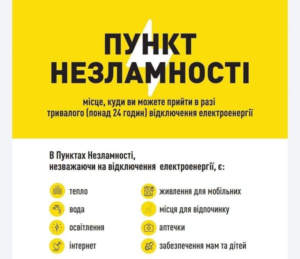 У Яворівському районі функціонує 38 Пунктів Незламності. У випадку відсутності електропостачання більш ніж на 24 години тут можна зігрітися, випити води, гарячого чаю або кави, з’їсти печиво. Також завжди можна підзарядити телефон чи інші гаджети. Дізнатися, де розташований найближчий Пункт незламності можна по інтерактивній карті на сайті: https://nezlamnist.gov.ua/ Повний список пунктів незламності на території району з адресами: Жителі Яворівщини, нагадуємо!Краковецький ЗЗСО I-III ступенів ім.Романа Шухевича Яворівської міської ради, смт Краковець, вул. Шухевича 5 Жителі Яворівщини, нагадуємо!Сарнівський ЗЗСО I-II ст., с. Сарни, вул. Шевченка, буд. 2 Жителі Яворівщини, нагадуємо!Яворівська ЗЗСО № 3 ім.Т.Шевченка, м. Яворів, вул. Святоюрська, 28 Жителі Яворівщини, нагадуємо!Яворівський навчально-виховний комплекс ” Заклад дошкільної освіти – початкова школа” м. Яворів, вул. Івана Хрестителя, 54 Жителі Яворівщини, нагадуємо!КМЦ “Сокіл”, м. Яворів, вул. Івана Франка, 10 Жителі Яворівщини, нагадуємо!м. Мостиська, Народний дім, вул. Грушевського, 18 Жителі Яворівщини, нагадуємо!Мостиська міська рада (адміністративний будинок), вул. Грушевського, 22 Жителі Яворівщини, нагадуємо!м. Мостиська, заклад освіти, вул.Міцкевича, 5 Жителі Яворівщини, нагадуємо!м. Мостиська, заклад освіти, вул.Шевченка, 2 Жителі Яворівщини, нагадуємо!м. Мостиська, заклад освіти, вул.Сагайдачного, 9 Жителі Яворівщини, нагадуємо!с. Твіржа Мостиської громади, Центральна 71 Жителі Яворівщини, нагадуємо!с.Гостинцеве Мостиської громади, Центральна, 4 (Адміністративна будівля старостинського округу) Жителі Яворівщини, нагадуємо!місто Новояворівськ, Шевченка, 1, “Палац культури “Кристал” Жителі Яворівщини, нагадуємо!місто Новояворівськ, Шевченка, 5., Новояворівська ЗЗСО №3 Жителі Яворівщини, нагадуємо!місто Новояворівськ, вул. Шевченка 16 А, Новояворівський ЗДО № 9 Жителі Яворівщини, нагадуємо!місто Новояворівськ, вул. Січових Стрільців 7, Новояворівська ЗЗСО №2 Жителі Яворівщини, нагадуємо!місто Новояворівськ, вул. Шевченка, 3, “ФОК “Старт” Жителі Яворівщини, нагадуємо!місто Новояворівськ, вул. Привокзальна 2, Новояворівський міжшкільний ресурсний центр Жителі Яворівщини, нагадуємо!місто Новояворівськ вул. Шевченка, 2 Волонтерський центр Жителі Яворівщини, нагадуємо!село Кам’янобрід вул. П.Андрусіва, 1А, Кам’янобрідський ЗЗСО Жителі Яворівщини, нагадуємо!село Добростани, вул. Героїв Майдану 71. Жителі Яворівщини, нагадуємо!смт Шкло, вул. Сагайдачного, 1 Жителі Яворівщини, нагадуємо!м.Судова, вул.Передмістя, Жителі Яворівщини, нагадуємо!м. Судова Вишня, пл. І.Франка, 14, Міська рада Жителі Яворівщини, нагадуємо!с. Шегині, Дружби 153, Народний дім Жителі Яворівщини, нагадуємо!с. Шегині, Дружби 184, адміністративний будинок Жителі Яворівщини, нагадуємо!Смт Івано-Франкове, вул.Львівська 50 Жителі Яворівщини, нагадуємо!Смт Івано-Франкове, вул.Ів.Франка 2 Жителі Яворівщини, нагадуємо!смт Івано-Франкове, площа Ринок, Центр ОМС Жителі Яворівщини, нагадуємо!с. Бірки, вул.Польова 18 Жителі Яворівщини, нагадуємо!с. Ясниська, вул.Шевченка 3 Жителі Яворівщини, нагадуємо!с. Домажир, вул.Центральна 1 Жителі Яворівщини, нагадуємо!с. Великополе, вул.Садова 29 Жителі Яворівщини, нагадуємо!Бердихівська сільська рада, вул. Ст. Бандери , 37 Жителі Яворівщини, нагадуємо!Старичівська сільська рада, вул. Шевченка, 23. Жителі Яворівщ