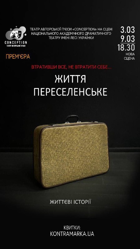 🎭3 березня, о 18.30, у Національному академічному драматичному театрі ім. Лесі Українки відбудеться вистава "Життя переселенське". Її створив маріупольський театр авторської п‘єси "Concepcion" за спогадами маріупольців.