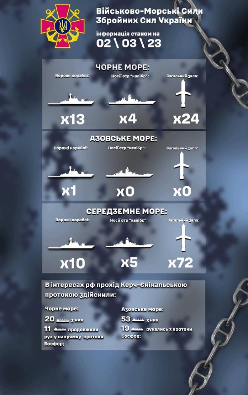 Станом на 02.03.2023: в Чорному морі на бойовому чергуванні знаходиться 13 ворожих кораблів