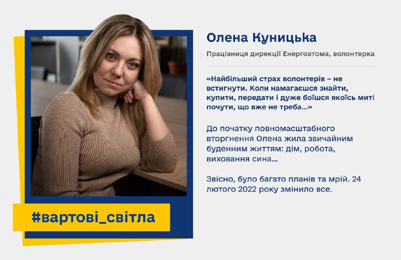 Олена Куницька, працівниця дирекції Енергоатома, волонтерка:  «Найбільший страх волонтерів – не встигнути. Коли намагаєшся знайти, купити, передати і дуже боїшся якоїсь миті почути, що вже не треба…» До початку повномасштабного вторгнення Олена жила звичайним…