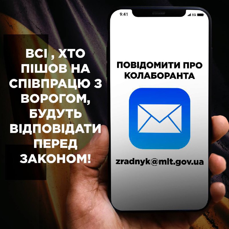 Повідомити про колаборантів ➡️ zradnyk@mlt.gov.ua Віримо у Збройні Сили України! 11.03.2023, Субота | 19:17 Автор допису: Міський голова Мелитополя Повідомити про колаборантів ➡️ zradnyk@mlt.gov.ua Віримо у Збройні Сили України! Наближаємо Перемогу разом! Джерело Друк / PDF