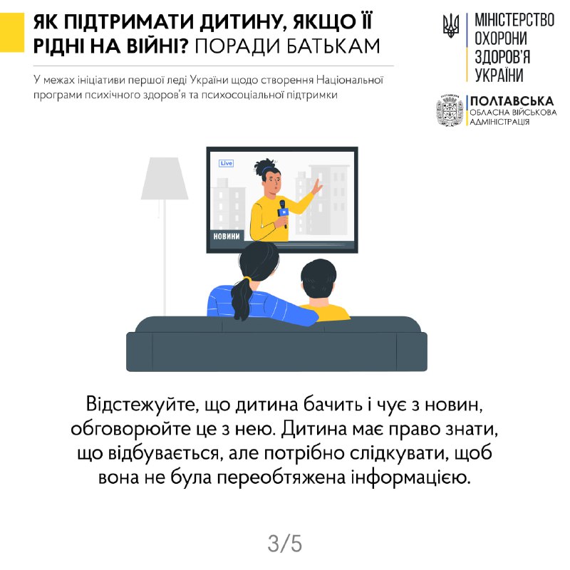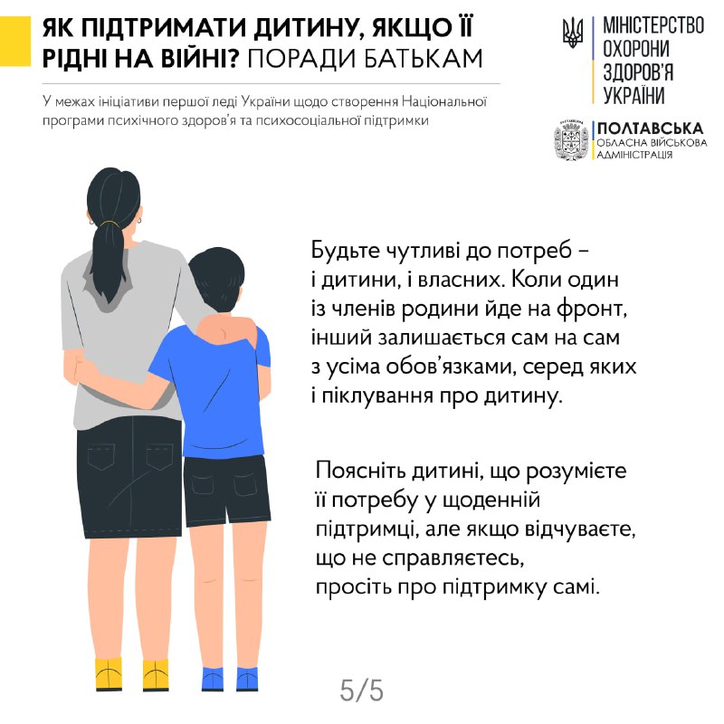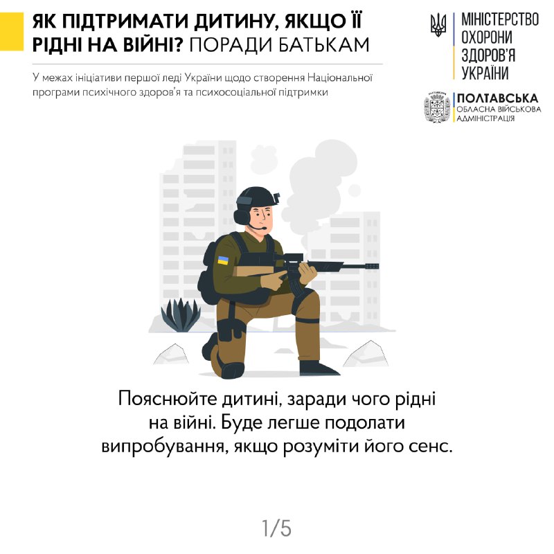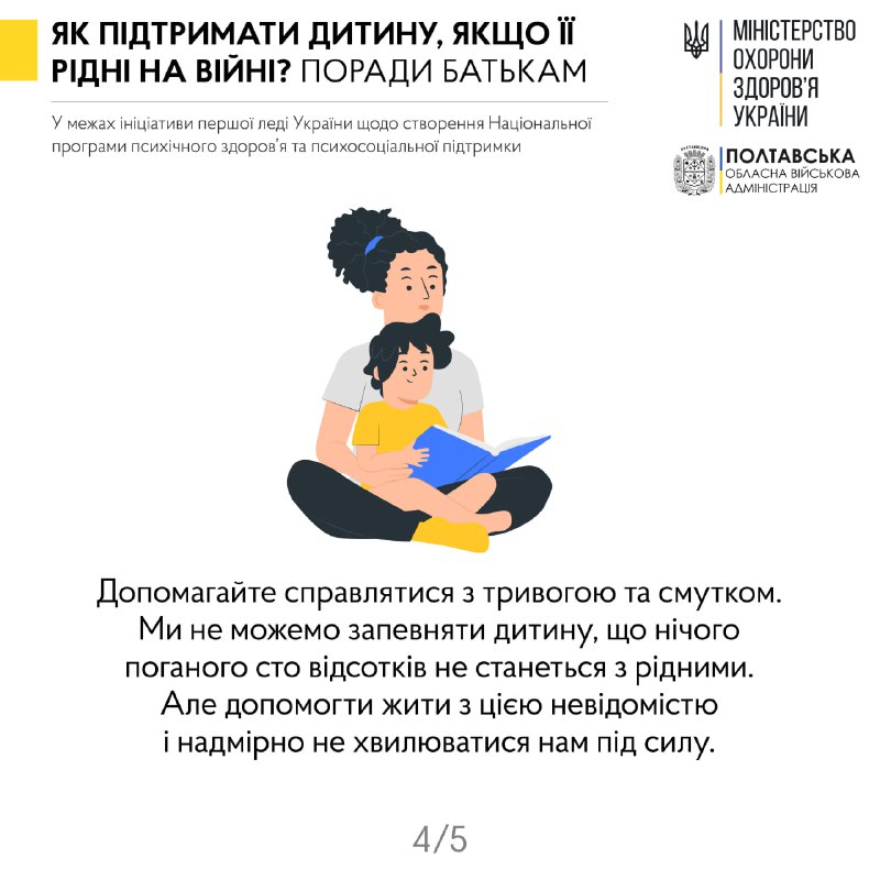 Війна – важке випробування для всіх. Важливо дбати про ментальне здоровʼя та підтримувати один одного. 14.03.2023, Вівторок | 18:27 Автор допису: Голова Полтавської обласної військової адміністрації Війна – важке випробування для всіх. Важливо дбати про ментальне здоровʼя та підтримувати один одного. Особливої уваги потребують діти, батьки яких наразі боронять країну. Фахівці зібрали корисні поради, як підтримати дитину, якщо її рідні на війні. Тримаємо стрій! Все буде Україна! 🇺🇦 Джерело Друк / PDF
