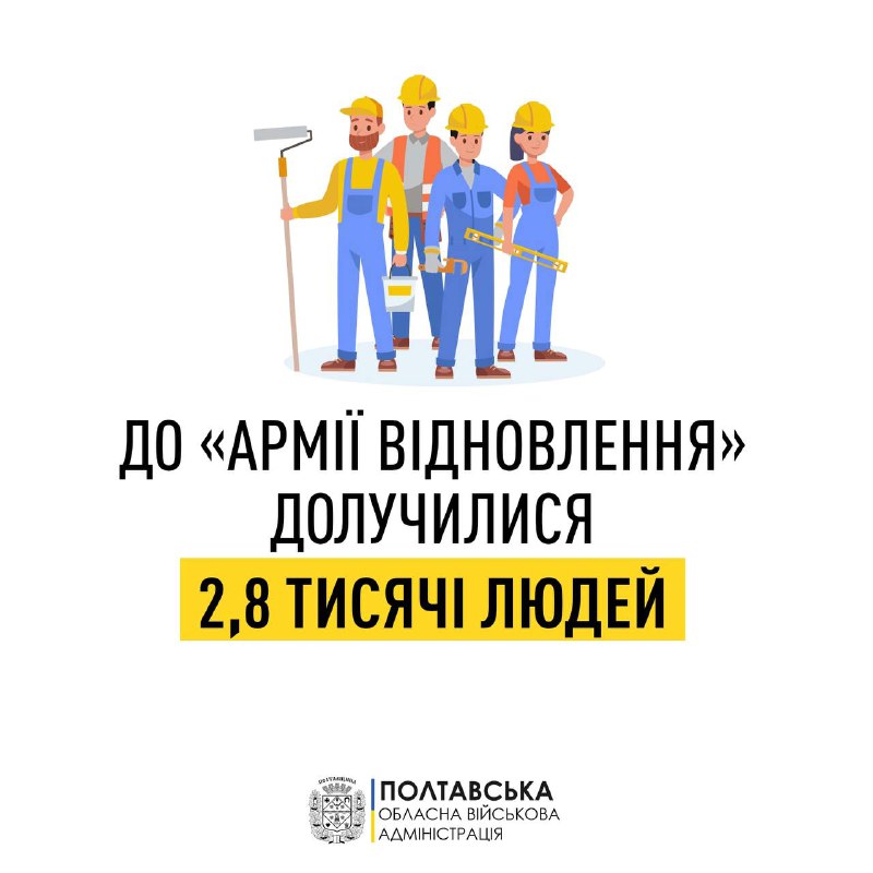 Полтавщина стабільно лідирує в реалізації програми «Армія відновлення». До суспільно корисних робіт залучили вже 2823 мешканців регіону 15.03.2023, Середа | 17:38 Автор допису: Голова Полтавської обласної військової адміністрації Полтавщина стабільно лідирує в реалізації програми «Армія відновлення». До суспільно корисних робіт залучили вже 2823 мешканців регіону. У першій п'ятірці також – Донецька, Сумська, Київська й Чернігівська області. Загалом працевлаштувалися в межах програми більше 9 тисяч безробітних. Допомагаємо одне одному! Все буде Україна!🇺🇦 Джерело Друк / PDF
