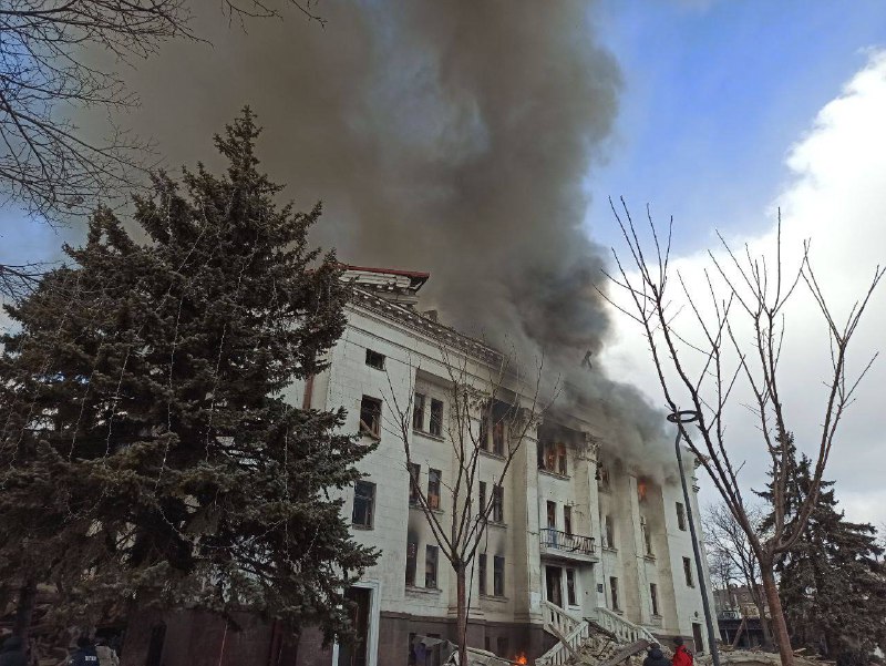 😔20 хвилин після російського бомбардування Драматичного театру. Можна побачити, куди влучили скинуті окупантами авіабомби. У будівлі ховалися маріупольські родини, загинуло сотні людей, серед яких – діти.