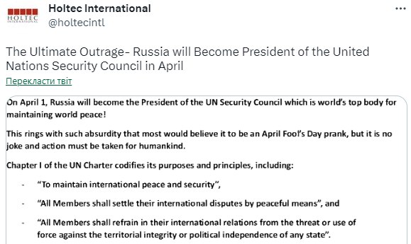 «Зрештою, світовий орган повинен виключити державу-порушника, чиї звірства не дають спокою совісті людства. Допустити шоу жахів, в якому росія відповідає за мир у всьому світі, було б образою на тлі кривавої бійні, яку вона спричинила народові України. Потурання злому путінському режиму не спрацювало і не спрацює. Правильні дії з боку США, Великобританії та Франції полягають у тому, щоб посилатися на Статут ООН і діяти негайно, щоб виключити країну, яка скоює злочини проти людяності з повною безкарністю», – говорить головний виконавчий директор «Holtec International».