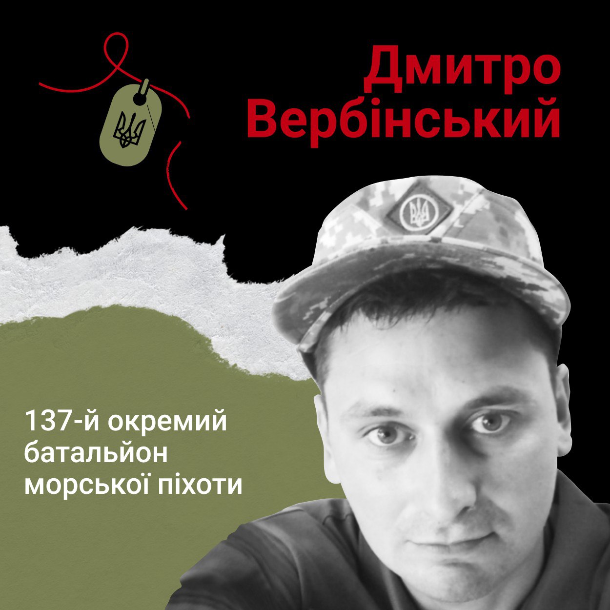 Морпіх 35-річний Дмитро Вербінський загинув 2 березня 2022 року під час оборони від окупантів Запорізької області. Виконуючи бойове завдання в місті Василівка, боєць отримав смертельне поранення в груди. Це сталося у день народження його сина. Хлопчикові виповнилося 9 років.