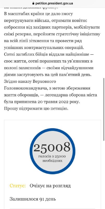 ✊ТАК! Петиція про започаткування Дня вшанування захисників Маріуполя набрала 25 тисяч підписів.