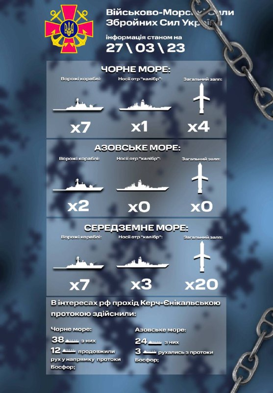 Станом на 27.03.2023: В Чорному морі на бойовому чергуванні знаходиться 7 ворожих кораблів