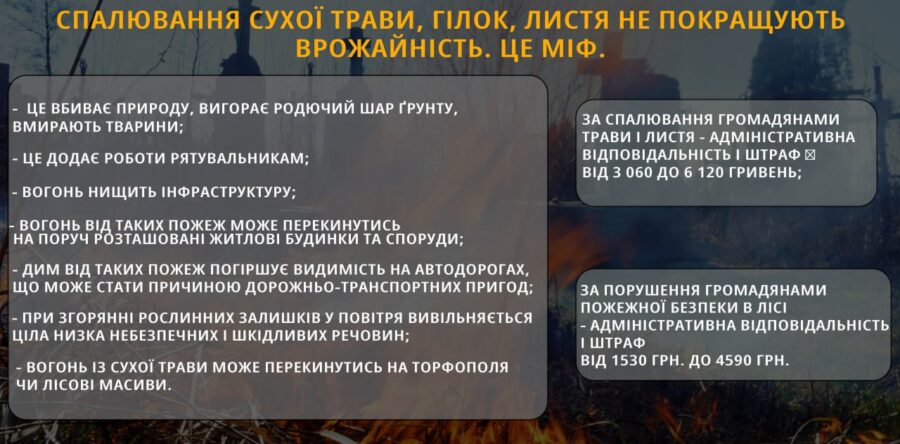Не паліть суху траву – не вчиняйте злочин! Рятувальники вкотре нагадують про заборону випалювання сухостою. Пам’ятайте, що спалювання сухостою може призвести до: