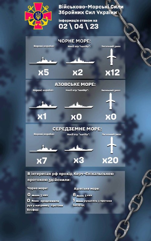 в Середземному морі до 7 ворожих кораблів, з них 3 носія крилатих ракет "Калібр", загальний залп до 20 ракет;