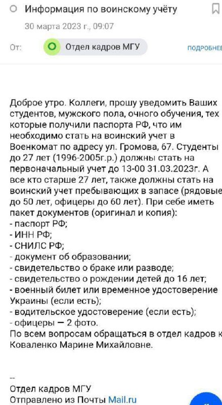 ☝️Викладачі окупованих маріупольських вишів отримали сповіщення, згідно з яким вони мають сповістити студентів про необхідність стати на військовий облік.