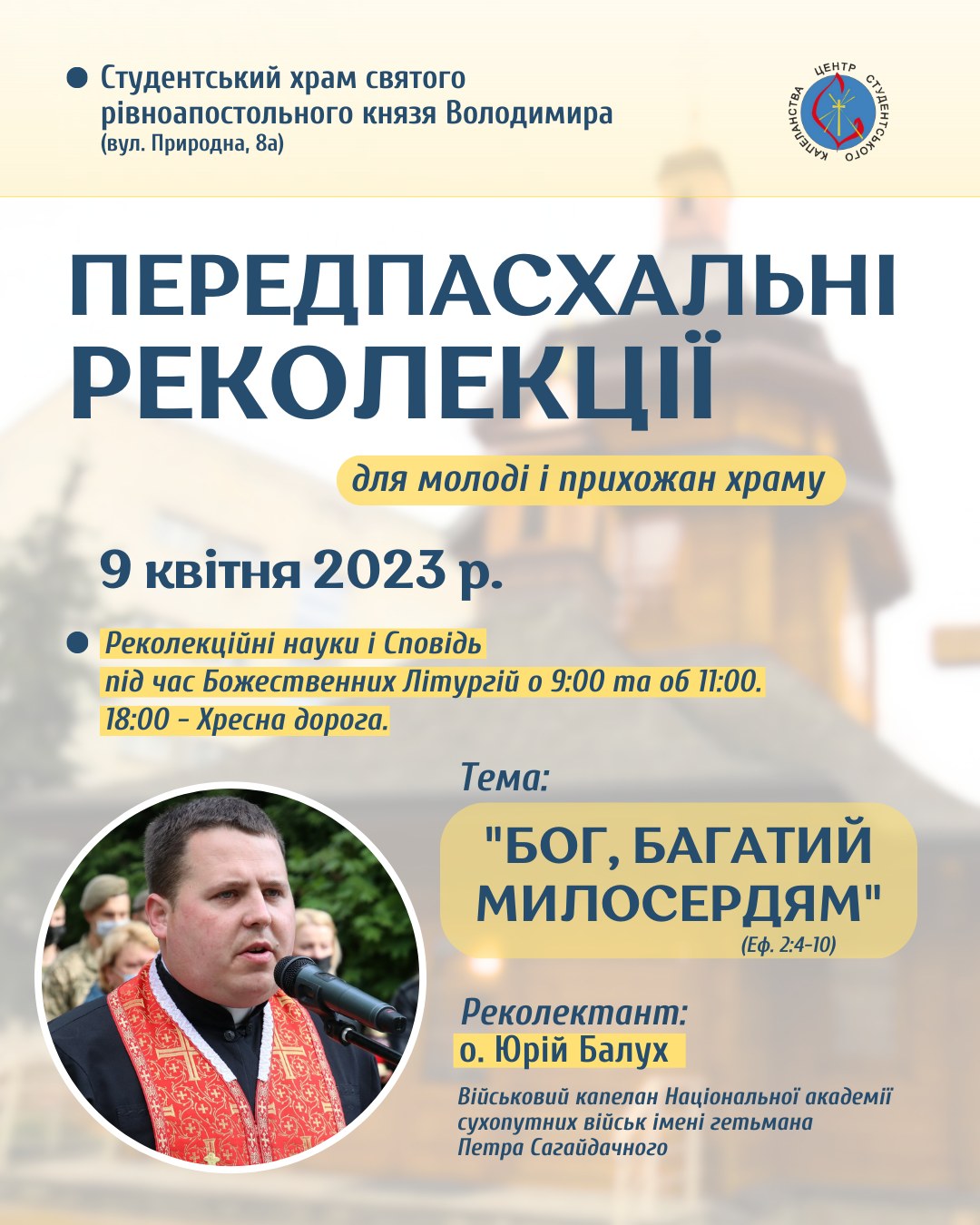 Цієї неділі, 9 квітня, у студентському храмі Святого Володимира відбудуться реколекції отця Юрія Балуха – військового капелана Національної академії сухопутних військ.