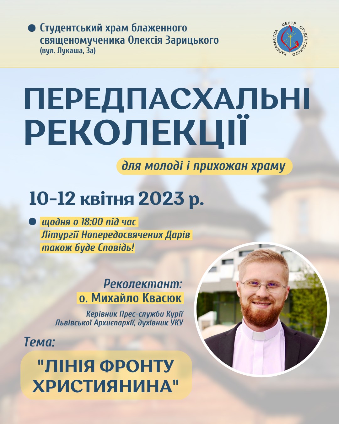 У Студентському храмі блаженного священномученика Олексія Зарицького 10-12 квітня відбудуться триденні передвеликодні реколекції.