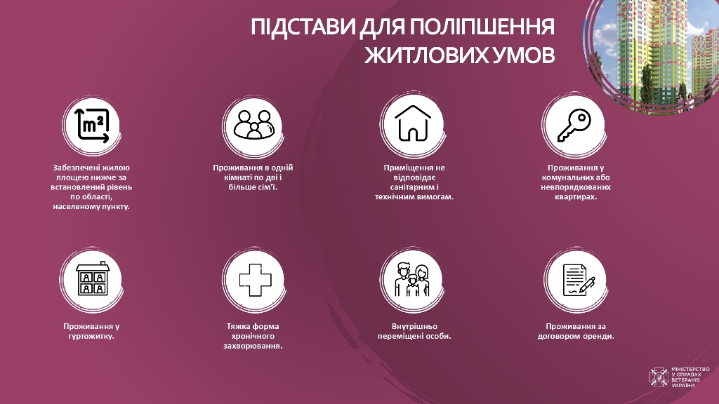У наведеній нижче інфографіці або за цим посиланнямІнфографіка щодо актуальних питань із забезпечення житлом ветеранів та членів їхніх сімей.pdfветерани на члени їхніх родин можуть отримати детальну інформацію щодо житлових питань, зокрема: