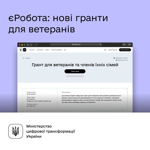 Будуємо країну підприємців! Проєкт запущено з ініціативи Прем’єр-міністра України Дениса Шмигаля, Міністерства економіки України спільно з Міністерством цифрової трансформації України, Міністерством аграрної політики та продовольства України, Державною службою зайнятості України та Ощадбанком за підтримки «Проєкту підтримки Дія», що реалізується Програмою розвитку ООН в Україні за фінансової підтримки Швеції. – єРобота: нові гранти на старт чи розвиток бізнесу для ветеранів Уряд розширює проєкт, тож від сьогодні доступні нові програми для учасників та учасниць бойових дій. З грантами від єРобота ветерани можуть запустити або ж масштабувати власний бізнес. – Заповнюйте заяву і завантажуйте бізнес-план за посиланням — https://diia.gov.ua/…/grant-dlya-veteraniv-ta-chleniv…