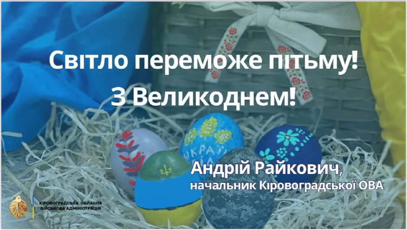 Дорогі земляки і землячки! Щирі Великодні вітання! В цей день молимось за Перемогу 16.04.2023, Неділя | 8:53 Автор допису: Голова Кіровоградської обласної військової адміністрації Дорогі земляки і землячки! Щирі Великодні вітання! В цей день молимось за Перемогу. За світле, мирне майбутнє. Просимо у Всевишнього захисту для хоробрих синів і дочок України, які зараз на передовій. Україна переможе!Христос Воскрес! Джерело Друк / PDF