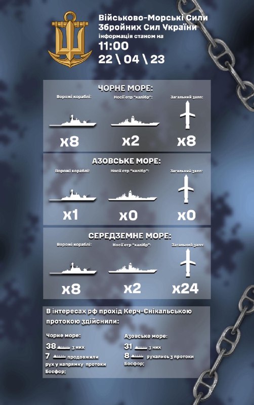 Станом на 11:00 22.04.2023: в Чорному морі на бойовому чергуванні знаходиться 8 ворожих кораблів