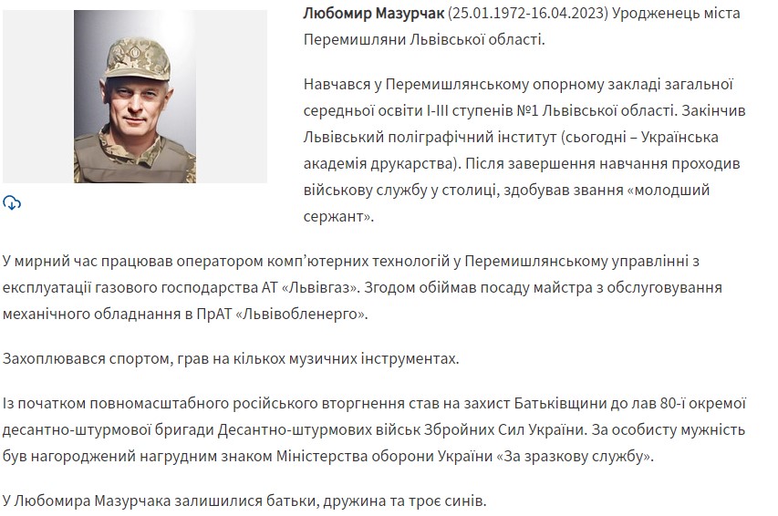 У суботу, 22 квітня 2023 року, єпископ-помічник Львівської Архиєпархії владика Володимир, у Гарнізонному храмі, звершив чин похорону трьох Героїв України: Любомира Мазурчака, Сергія Лемця та Миколи Ковалишина.