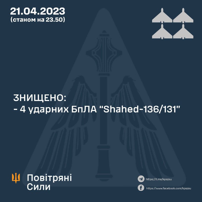Увечері 21 квітня 2023 року близько 19.00 години противник атакував Україну з південно-східного напрямку ударними дронами-камікадзе «Shahed-136/131».. Силами та засобами протиповітряної оборони повітряного командування «Схід» Повітряних Сил у взаємодії з ППО Національної гвардії України знищено чотири із п’яти «шахедів». ✊Тримаймо небо! 🇺🇦 Разом – до перемоги!
